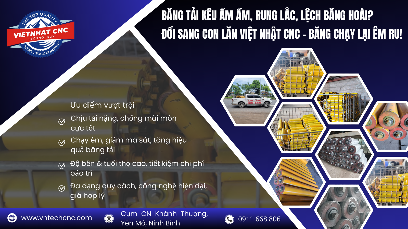 Nếu anh em đang gặp những tình trạng này, đã đến lúc đổi sang Con Lăn Băng Tải Việt Nhật CNC – dòng con lăn được thiết kế riêng cho môi trường mỏ đá, vật liệu xây dựng, cho băng tải chạy lại êm, ổn định, ít hỏng vặt.