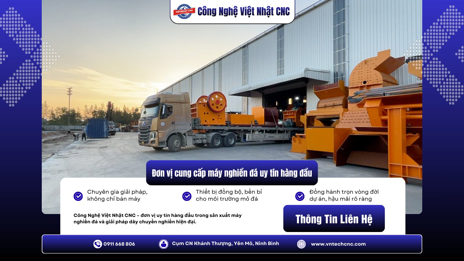 Công Nghệ Việt Nhật CNC – Đơn vị cung cấp máy nghiền đá uy tín hàng đầu, chuyên tư vấn giải pháp và cung cấp dây chuyền nghiền sàng đồng bộ, bền bỉ, hiệu quả cho các mỏ đá trên khắp Việt Nam.