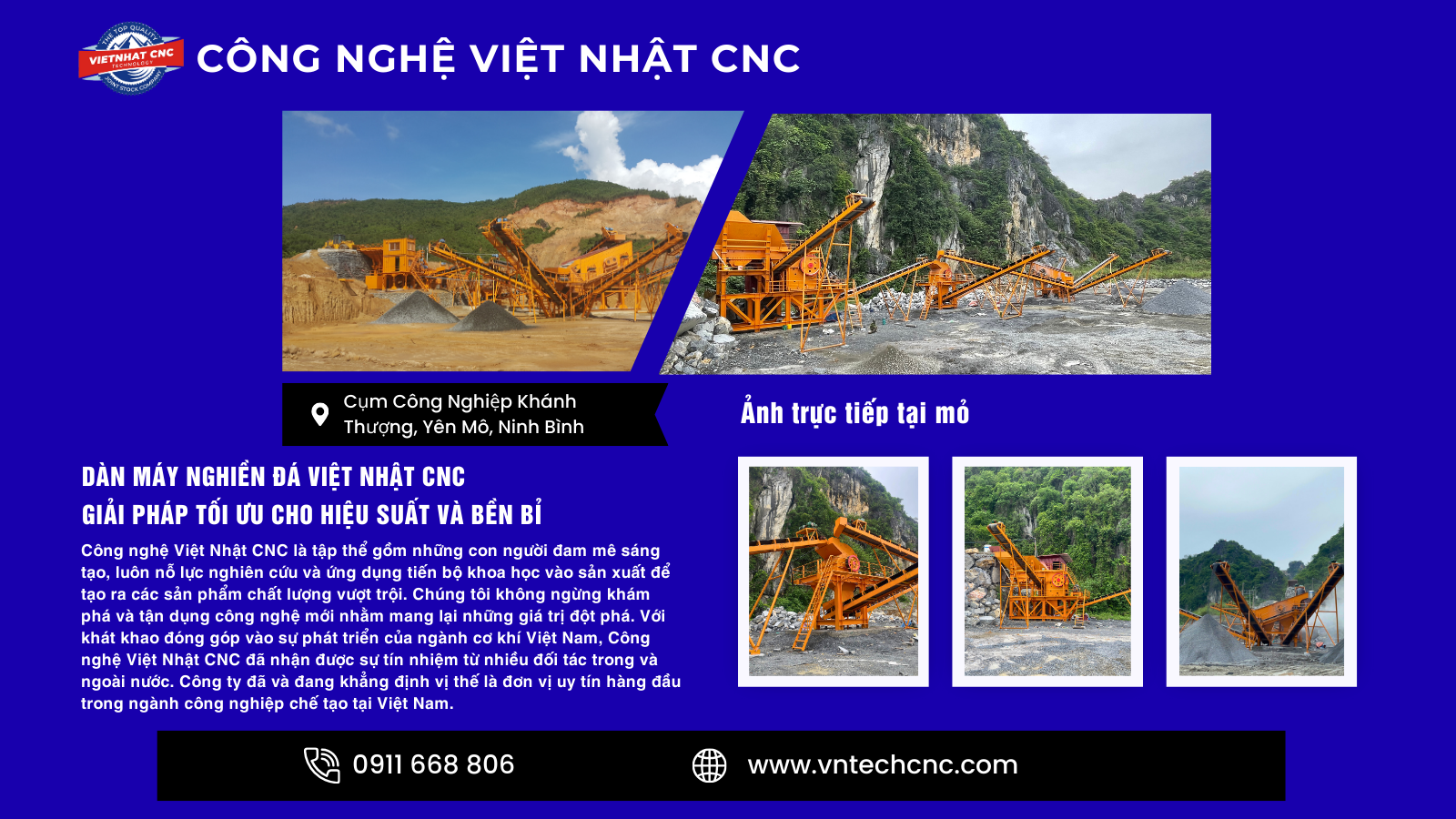 Công Nghệ Việt Nhật CNC tự hào là đơn vị cung cấp các dây chuyền máy nghiền đá với công nghệ tiên tiến, thiết kế hiện đại, đáp ứng tối đa yêu cầu của các công trình lớn. Được xây dựng với mục tiêu nâng cao năng suất và tiết kiệm chi phí cho khách hàng, máy nghiền đá Việt Nhật CNC là sự lựa chọn hàng đầu cho các dự án khai thác và sản xuất đá hiện nay.